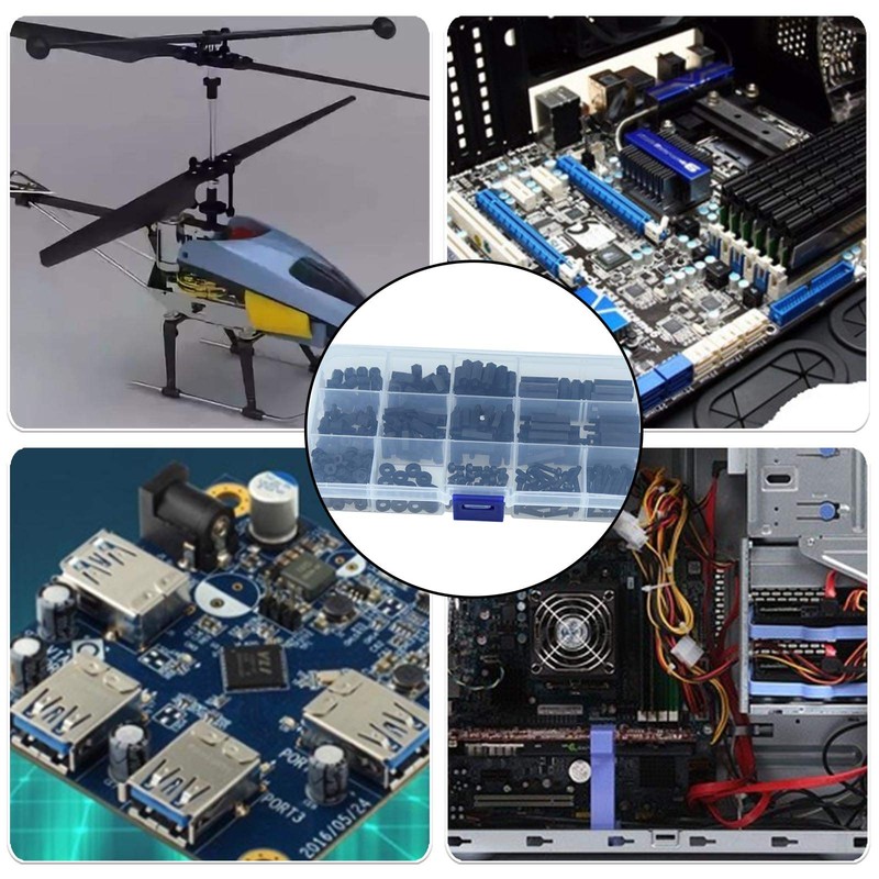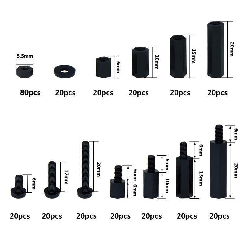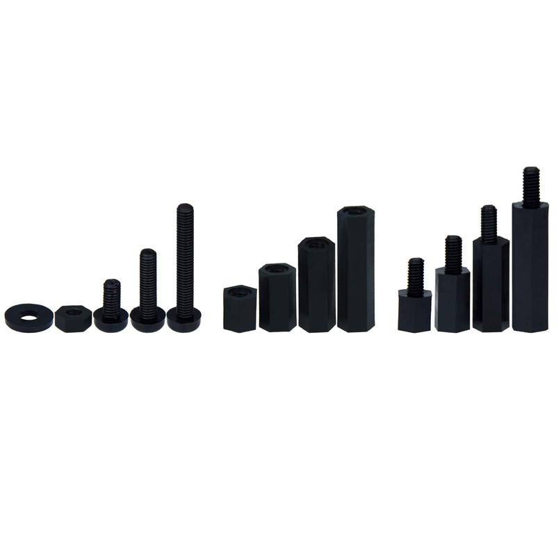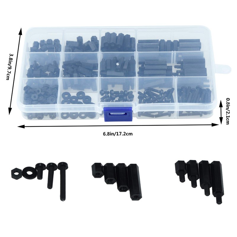 - Package Content: 320pcs M3 Hex Spacer Standoff Kit, sufficiont quantity to meet you different needs. Comes with the plastic box, all the parts are in their individual compartments - spacers, screws, nuts and stand-off.