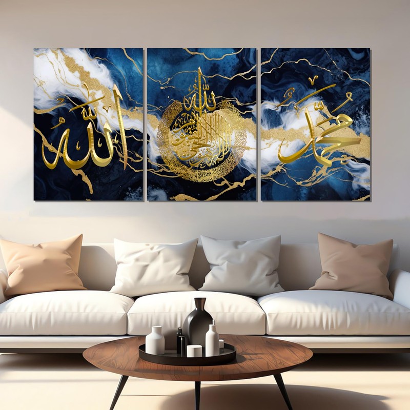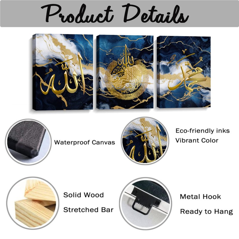 - Islamic Canvas Wall Art Set of 3:With its Islamic motifs and meaningful symbolism, this canvas wall art perfectly captures the essence of Muslim culture and spirituality.It serves as a reminder of faith, devotion, and the importance of connecting with one's religion.Each canvas art painting is installed with a metal hook, which can be easily hung on the wall.