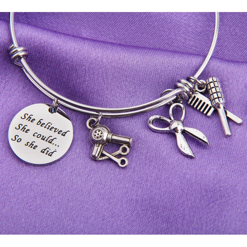 beautiful stainless steel personalized cosmetology charm bracelet Features a hand polished stainless steel laser etched "she believed she could so she did" charm, detailed Shears charm, blow dryer charm, comb charm! "
