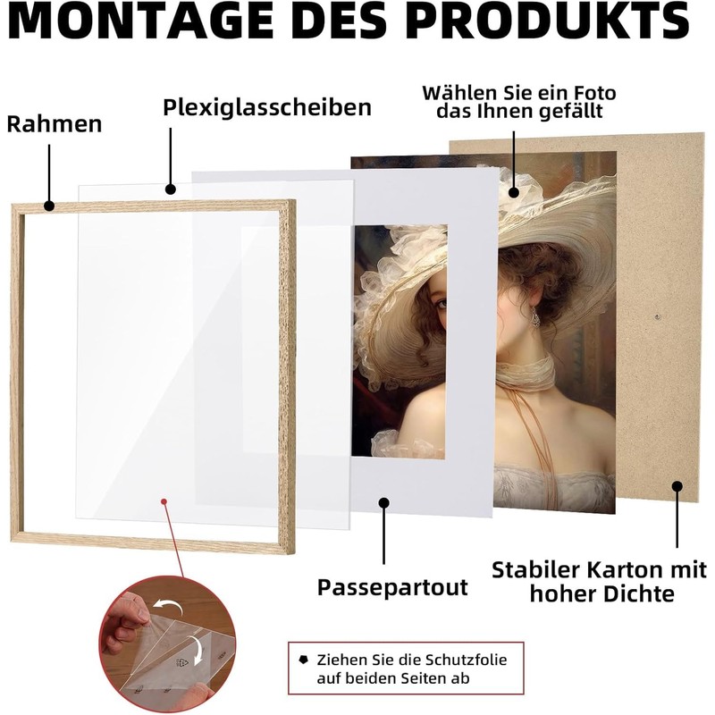 - Photo frame set: the boards are made of acrylic glass so they won't break when dropped, perfect for children's rooms. The acrylic glass has a protective film on both sides that must be removed.