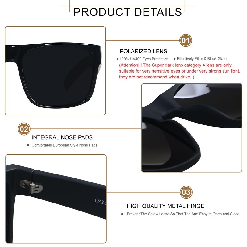 - [DARK BLACK POLARIZED LENSES] Extra Large Sensitive Eyes Sunglasses mens womens use high quality 1.1mm TAC polarized lens with UV400 rated protection, can filter out sunlight reflected glare and protect your eyes from long term damage by blocking harmful UVA and UVB rays.(Attention!!! The Super dark lens category 4 lens are only suitable for very sentative eyes or under very strong sun light , they are not recommend when drive. )