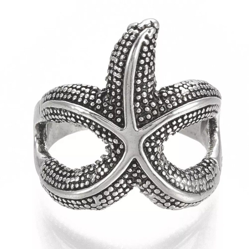 Alloy Cuff Finger Rings, Wide Band Rings, Starfish, Antique Silver