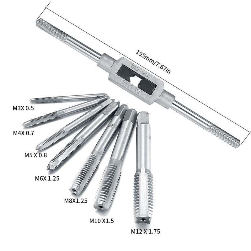 - 【What You Will Get】You will get 7 pcs taps in different sizes of M3, M4, M5, M6, M8, M10, M12, and one tap wrench, which is enough for daily use, and also a great gift to your friends who love handwork.