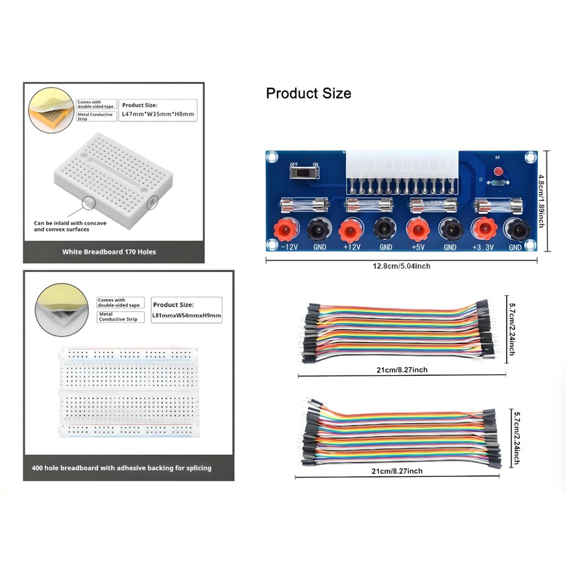 • Complete DIY Electronics Kit: Includes ATX power supply breakout, jumper wires, breadboards, and test cables.