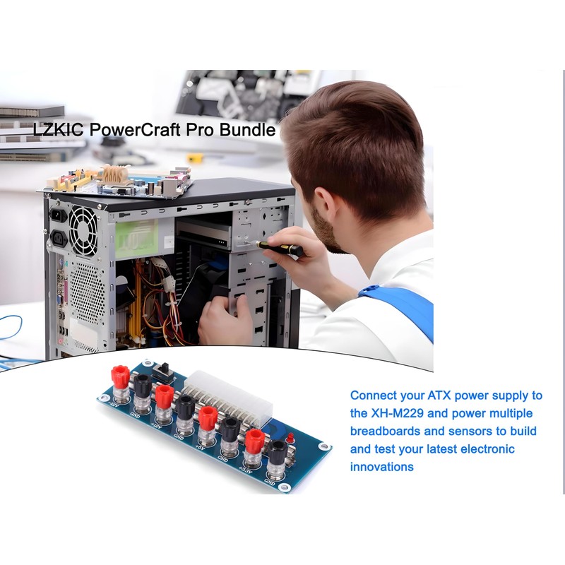 LZKIC PowerCraft Pro Bundle XH-M229 ATX Power Supply Breakout Adapter Module, Jumper Wires, Breadboards & Test Cables DIY Electronics Kit for Arduino, Benchtop, Desktop PC Projects