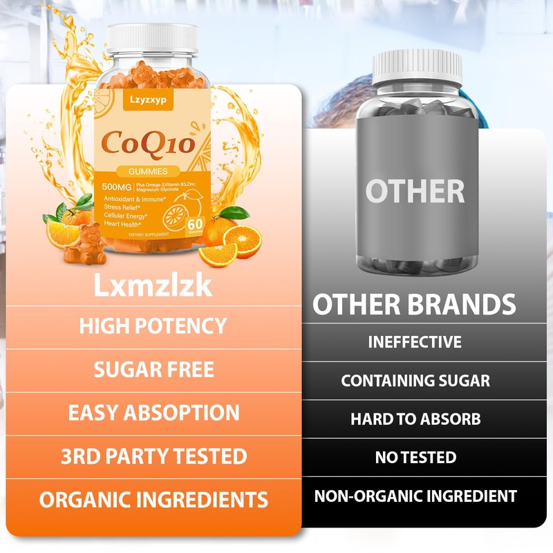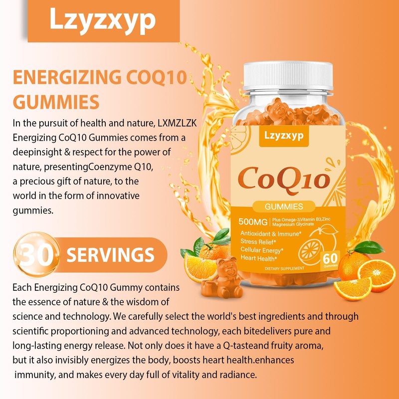 Lzyzxyp CoQ10 Oranges Gummies 500mg-3X Better Absorption Coenzyme Q10 Supplements - Plus Omega-3, Magnesium, Vitamin B3 & Zinc for Heart Health, Cellular Energy & Antioxidant, Vegan, Non-GMO 60 Ct (1)