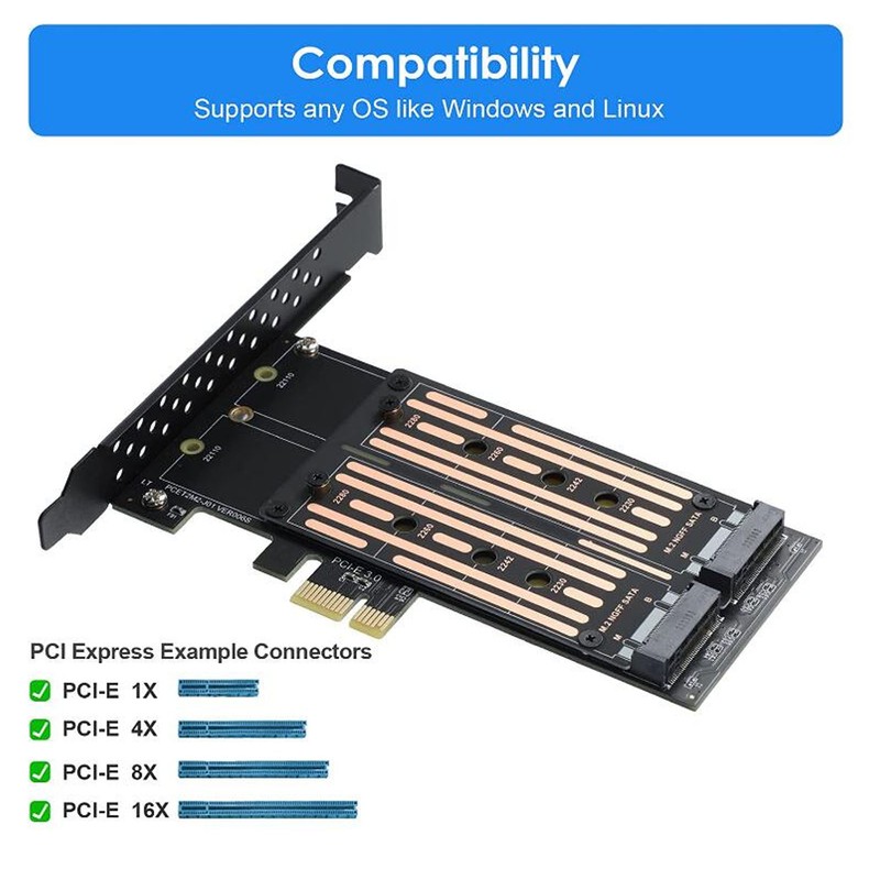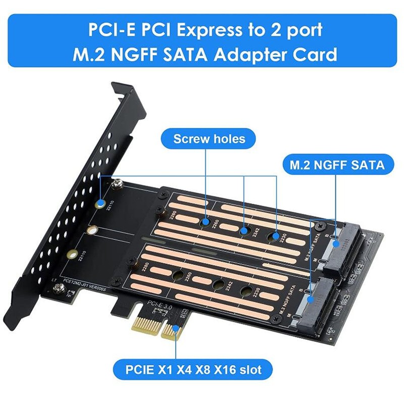1、High Speed: With this M.2 SATA SSD NGFF to PCIE adapter, 2 M.2 SATA ports are expanded from the PCIe slot on the host. The SATA ports can transfer data at 6Gbps, 3Gbps, and 1.5Gbps. 2、NCQ Supported: This dual M.2 PCIE adapter supports native command queuing, support SATA controller AHCI 1.0 programming interface register, support active power management, support error reporting, recovery, and rectification. 3、MSI Supported: This M.2 PCIe adapter card supports MSI, programmable transmitter signal levels, FIS switching based on port multiplier switches or commands, and staggered spin up. 4、Widely Compatible: This NGFF to PCIE adapter card is suitable for Win 7/8/8.1/10/11 Server 2003/2008 R2, 2016, for Linux 2.6.x or higher. 5、Low Power Consumption: This M.2 SATA SSD to PCIE card adopts for MCIRON JMS582 chip, provide high signal quality and reliability for programmable high speed PHY, while ensuring video data security.