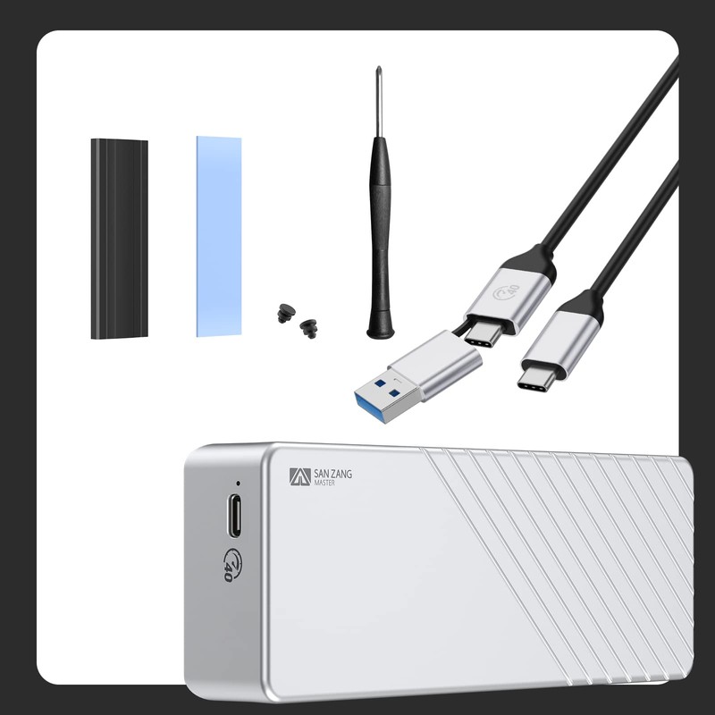 - Package Contents: 1 x M.2 NVME SSD external case; 1 x 2-in-1 cable (Type-C to Type-C/USB-A - 40Gbps) 11.8 inches (30 cm); 1 x Heat-dissipating silicone pad; 1 x Screwdriver; 2 x Anti-Vibration rubber plug for SSD; 1 x Aluminum alloy heat dissipation vest. We provide a 1 year warranty from your purchase to avoid any damage to our product. If there is any problem, please feel free to contact us. Note: If the disc partition is not recognized, there are multiple reasons and you need to check whether the original partition is damaged, so please contact us immediately and let us know the specific problems. We provide the most suitable solution for you