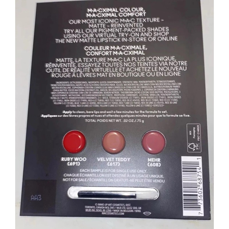 M·A·C 2x MAC Macximal Matte Lipstick Sample 3 Shades Ruby Woo Velvet Teddy Mehr New