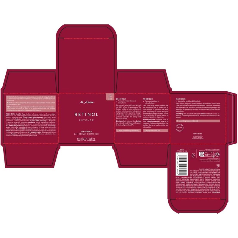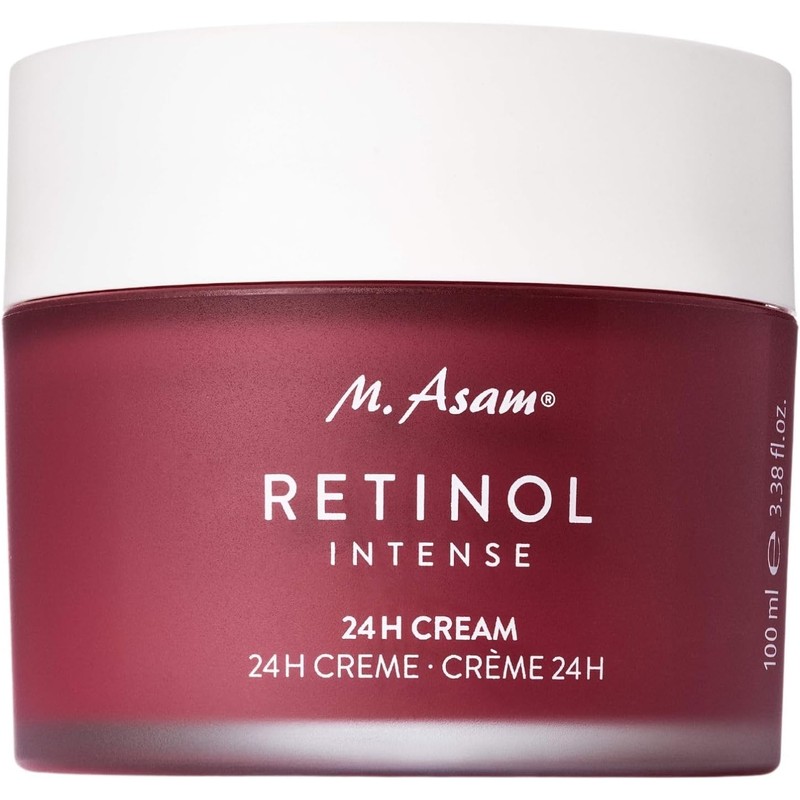 M. Asam Retinol Intense 24h Cream (100 ml): Anti-aging cream for combination skin with hyaluronic acid, retinol, shea butter, and rosehip oil. Cocoa butter scent. 100 ml bottle (7.7 x 7.7 x 6.9 cm). Suitable for adults.