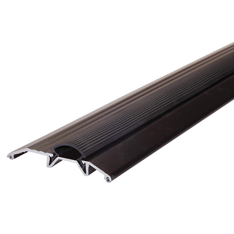 M-D threshold, Deluxe, low, heavy duty, 3-3/4 in width, 36 in length, 3/4 in height, aluminum, bronze, with replaceable vinyl insert. Deluxe model threshold with built in vinyl seal. Heavy duty aluminum and vinyl design assures years of protection from the elements. Installing a threshold will help to seal out drafts from the bottom of your door. A door sweep is recommended to be used with this threshold to provide the best weather tight seal. Helps make your home more comfortable and saves energy.