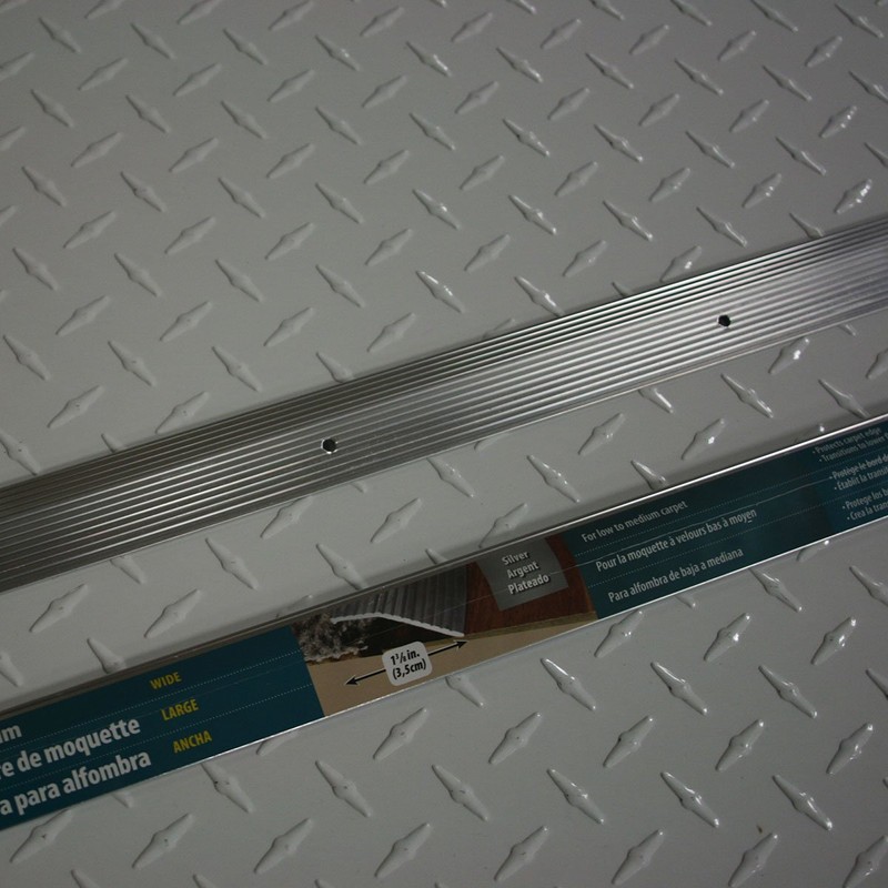The 1-3/8-Inch x 36-Inch Fluted Silver Carpet Trim easily covers a seam or gap between two flooring surfaces of unequal height. Carpet Trim prevents carpet edges from fraying, vinyl floor seams from curling and creates a smooth transition between different flooring surfaces. Aluminum trim is easily secured to wood and concrete floors with provided Screw Nails. For installation on concrete floors use Wooden Pegs (sold separately).