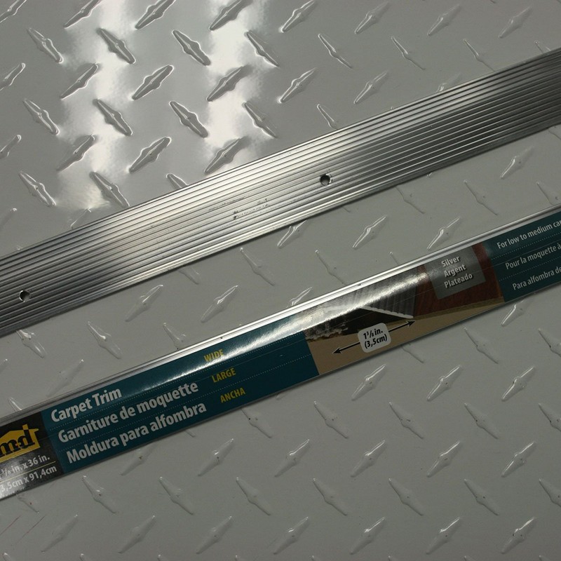 M-D Carpet Trim, Wide, Fluted, M-D, 1-3/8 in Width, 36 in Length, 0.3 in Height, Fasteners: Screw, Nail, Metal, Silver, For Doorways, Room Entry Ways or Other Locations Where Two Flooring Surfaces Meet. The 1-3/8-Inch x 36-Inch Fluted Silver Carpet Trim easily covers a seam or gap between two flooring surfaces of unequal height. Carpet Trim prevents carpet edges from fraying, vinyl floor seams from curling and creates a smooth transition between different flooring surfaces. Aluminum trim is easily secured to wood and concrete floors with provided Screw Nails. For installation on concrete floors use Wooden Pegs (sold separately).