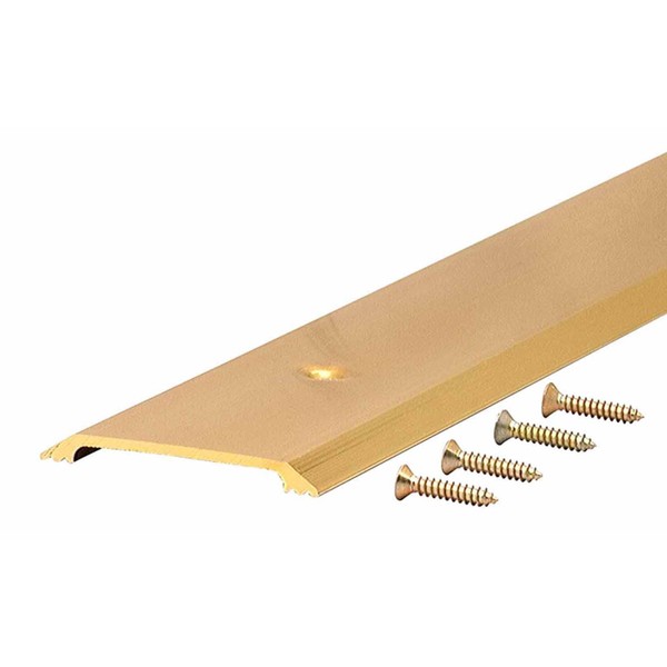 M-D top threshold, flat, smooth, series: Ultra, 2-1/2 in width, 36 in length, 1/4 in height, fasteners: screws, suitable for use with: low pile carpet or tile, aluminum, bright dip, Gold, UL listed, ADA approved. Extruded aluminum smooth flat top threshold. Use with low pile carpet or tile. Includes screws.