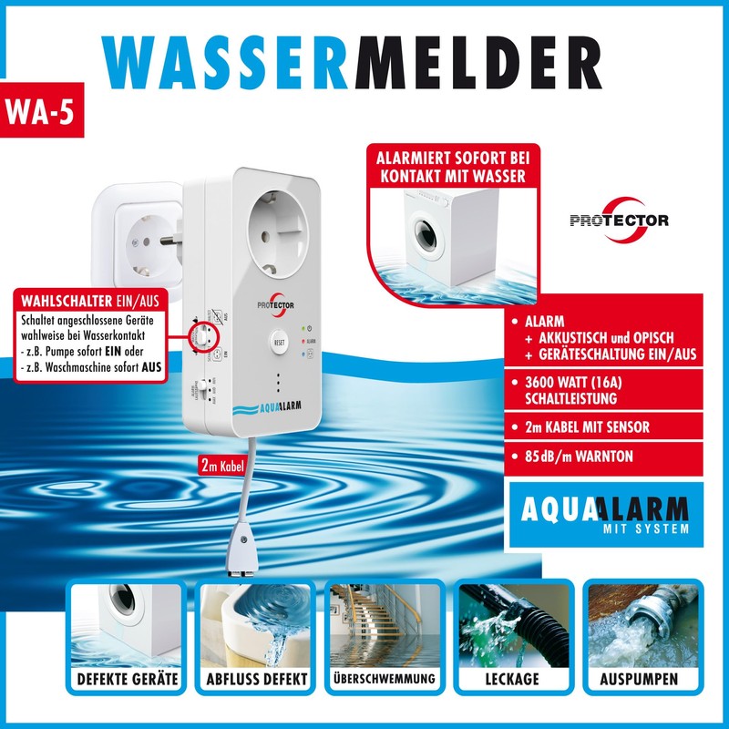 - Many expensive household floods could be avoided if warned in time. In addition to the alarm message, this water alarm switches devices connected to the device immediately after contact with water optionally on or off: