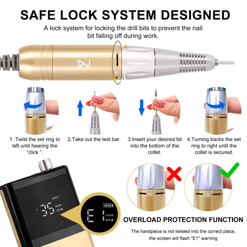 - Safety Features: Forward/reverse control and automatic pressure protection system.Safe & Protective: Built-in automatic protection stops the device from operating under excessive pressure, ensuring safe use. Follow the recommended RPM settings for the best results: 8000-12000 RPM for nail prep, 15000 RPM for sanding, 25000 RPM for gel removal, and 30000 RPM for shortening nails.