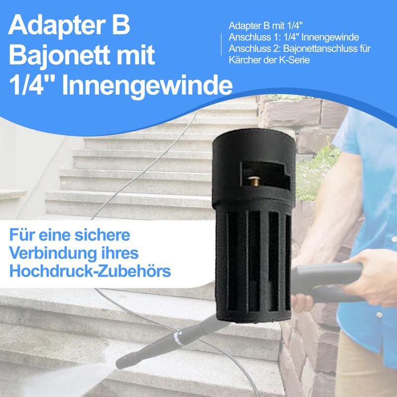 - Adapter B with 1/4" female thread - Connector 1: 1/4" female thread - Connection 2: Bayonet connection for Kärcher bayonet adapter of the K series - Material: plastic - 1/4" thread made of high-quality brass - Universal compatibility: Choose from a wide range of adapters for pressure washers of various brands such as Kärcher, Kränzle, Nilfisk and many more to efficiently connect high pressure accessories.
