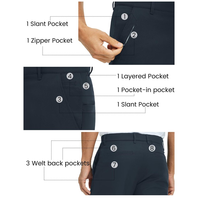 - Pockets: Featuring the practical 8 pockets, our mens pants slim fit offer ample storage for all your essentials. 2 deep slant pockets, 1 left layered pocket, 1 pocket-in pocket and 1 zipper pocket, 1 welt left pocket and 2 welt back pockets