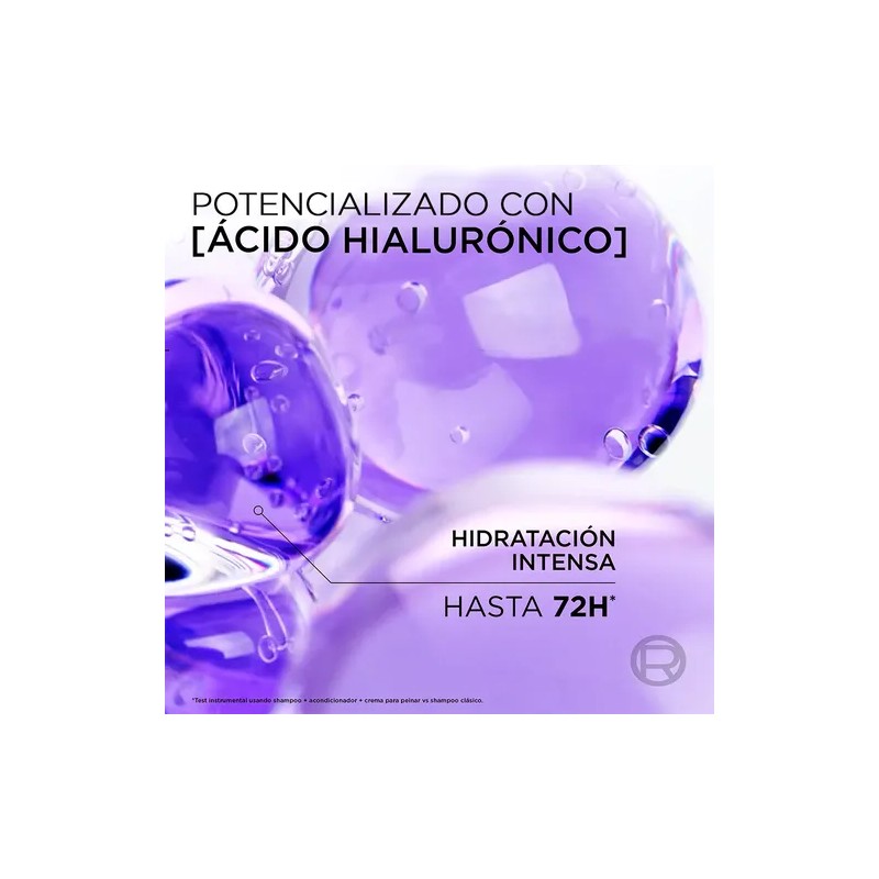 Consigue hidratación profunda hasta por 72 horas. Mascarilla con ácido hialurónico que deja el pelo ligero y con movimiento.