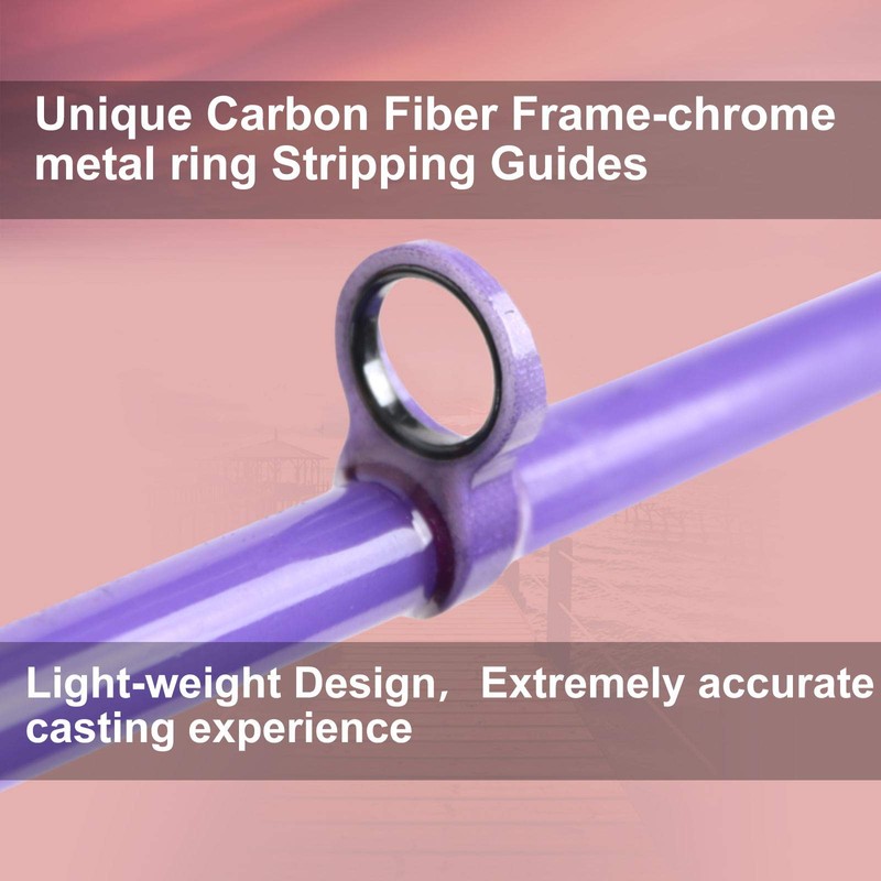 - High Performance: Unique carbon fiber frame-chrome metal ring stripping guides, hard chromed snake guides, and Over-sized tip loop; Light weight design; Extremely accurate casting experience
