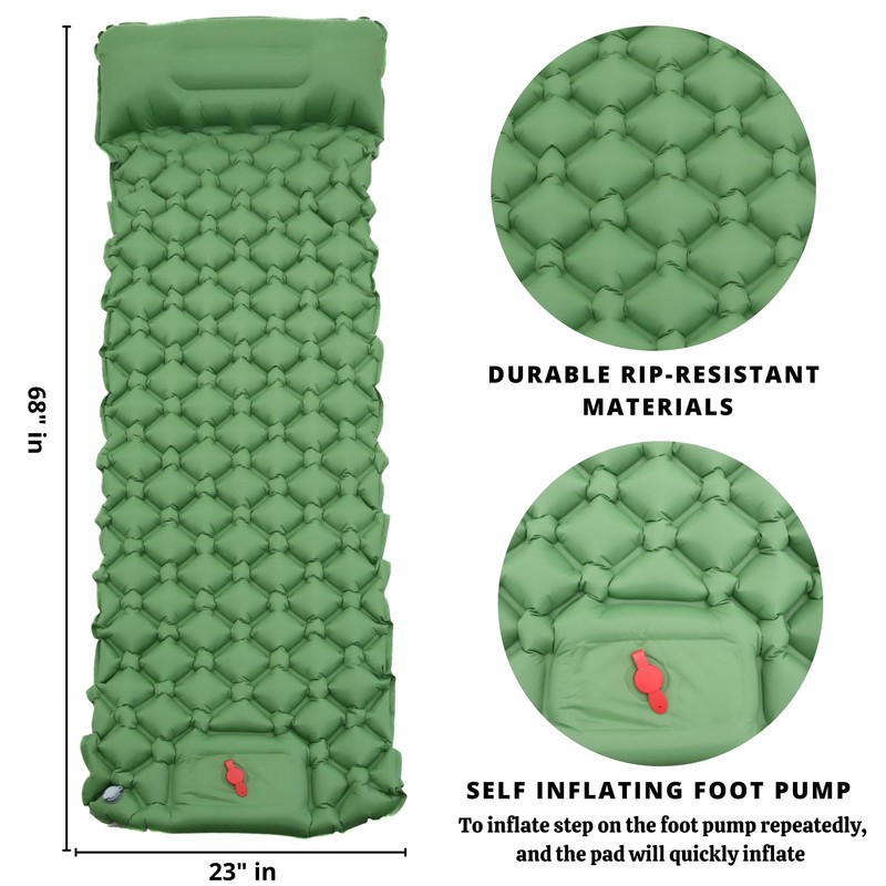 Prepare to experience the ultimate blend of convenience and comfort with this self-Inflating Sleeping Mat, designed with military precision and constructed from durable, rip-resistant materials; this sleeping mat is a testament to resilience and reliability in the field. It features an integrated foot pump, which inflates quickly and effortlessly, eliminating the need for external pumps or manual blowing. Its lightweight and compact design makes it perfect for backpacking, camping, and other outdoor adventures. Crafted from high-quality, rip-resistant materials, this mat is made to withstand rugged terrain and provide long-lasting durability. The cushioned surface ensures outstanding comfort, allowing you to enjoy a restful night's sleep on uneven ground.