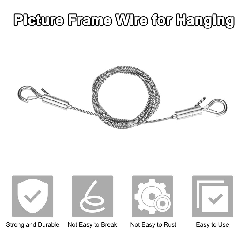 1. Our wire to hang pictures on wall is easy to use. The length of the metal rope can be manually adjusted. When using it, you only need to connect it to the hanging hook of the picture frame or artwork, and then adjust it to the appropriate length to hang it.