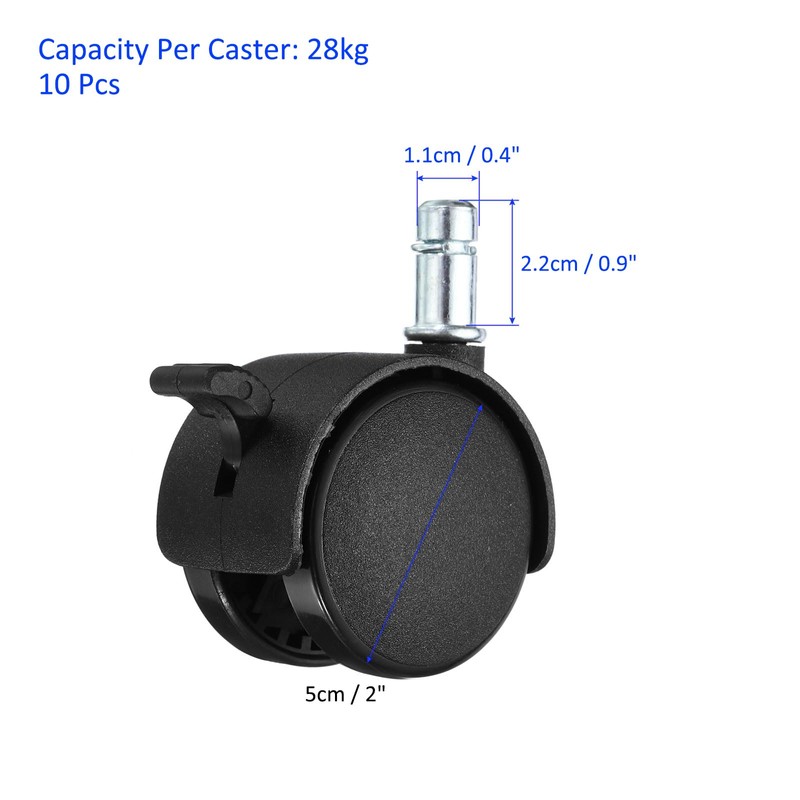 - PACKAGE INCLUDE: 10 Pack of Swivel Casters, which size is Wheel Diameter: 5 cm/ 2 inch, Thread Length: 1.5 cm/ 0.6 inch, Thread Diameter: 0.98 cm/ 0.4 inch, Capacity Per Caster: 28kg.