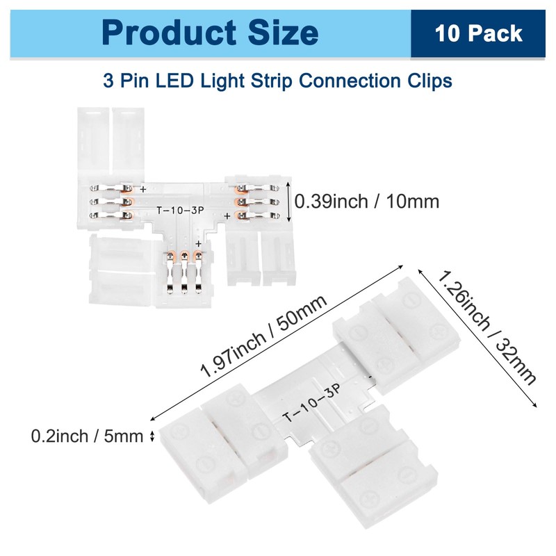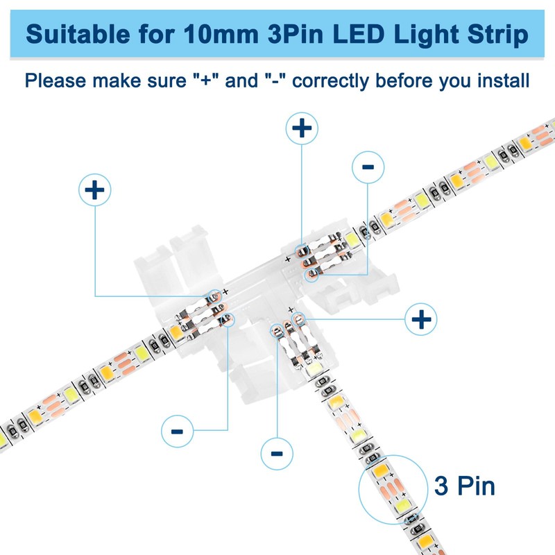 • [Size & Package] - Each pack contains 10pcs 3 pins LED light strip connection clips with an internal width of 10mm. They are specially designed for DIY lighting projects and can easily connect light strips or repair damaged light strips, providing a convenient and versatile solution