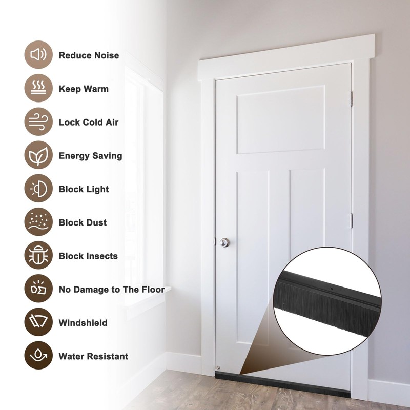- [Functional Design] - The door brush uses closely arranged bristles to effectively seal the gap between the bottom of the door and the top of the door step or floor surface, greatly reducing the penetration of light, air, wind, rain, snow, leaves, preventing heat loss, and controlling the penetration of dust and smog