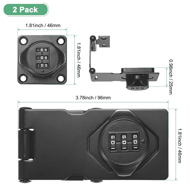 • [Size & Package] - Hasp size: 3-3/4" (96mm) L x 1-13/16" (46mm) W; Lock base size: 1-13/16" (46mm) L x 1-13/16" (46mm) W x 0.9"(25mm) H; Package includes 2pcs password gate latch, 12pcs screws,2pc password change tool
