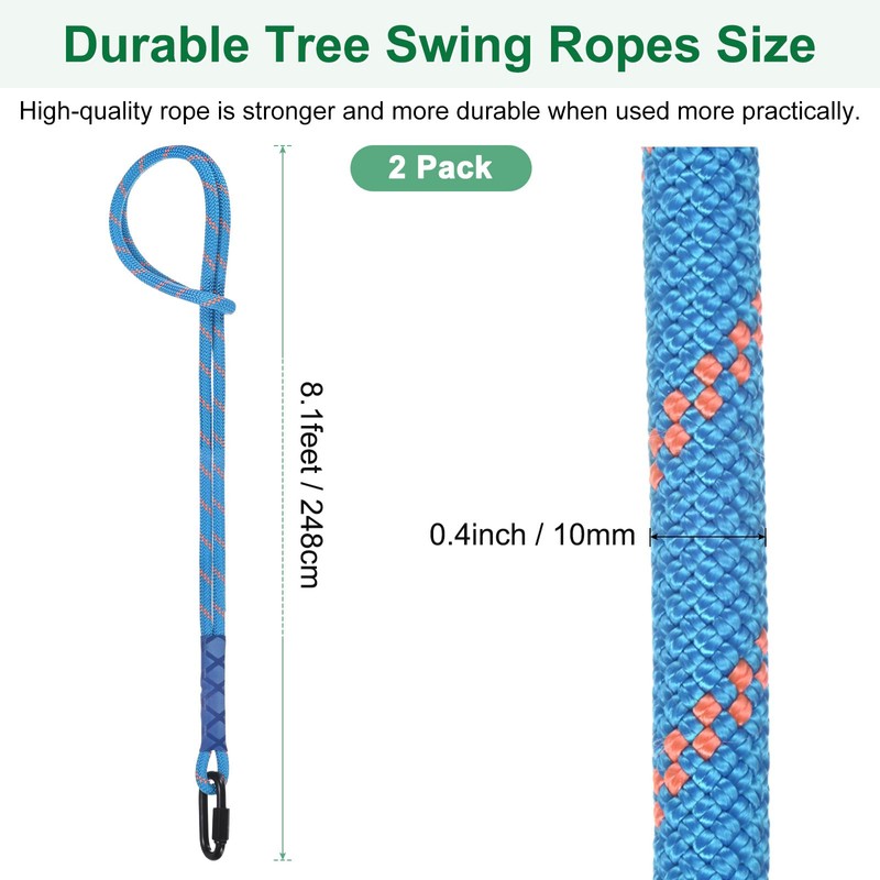 - [Size & Package] - The total length of the tree swing strap is 8.1 feet/248cm, and the overall rope diameter is 10mm. The spiral hook opening diameter is 8mm. Package: 2-pcs x swing ropes, color: Blue