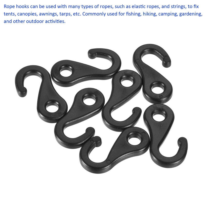 Rope hooks can be used with many types of ropes, such as elastic ropes, and strings, to fix tents, canopies, awnings, tarps, etc. Commonly used for fishing, hiking, camping, gardening, and other outdoor activities.