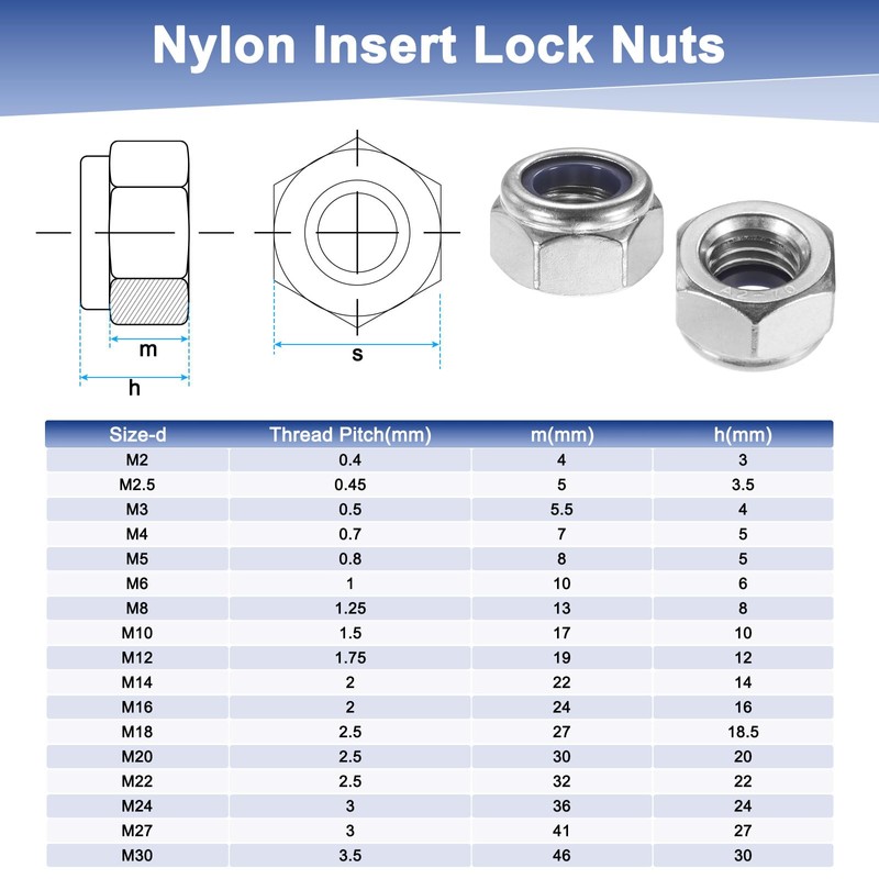 - [Advantage] - When the nylon lock nut is tightened, the thread of the bolt will naturally squeeze the nylon ring, forming a tight fit. Rely on the elasticity of the nylon material, frictional resistance is generated, thereby achieving an anti-loosening effect