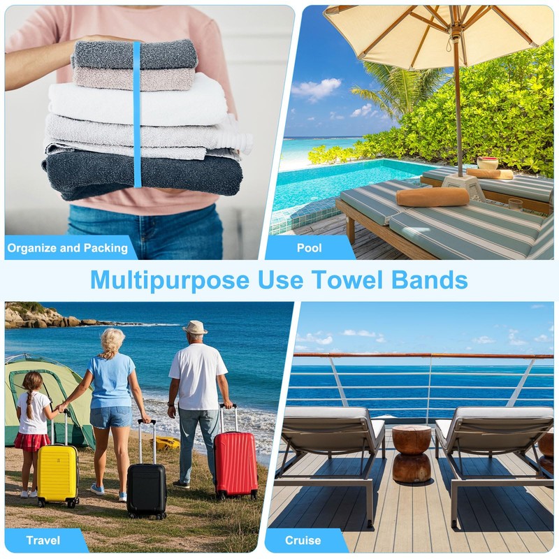 Handtuchbänder behandeln die Probleme traditioneller Handtuchklammern, wie sie leicht vom Wind weggeblasen werden und altern. Sie können Handtücher an Strandstühlen, Kreuzfahrtstühlen und Poolstühlen befestigen. Sie sind unverzichtbar für Strände, Schwimmbäder, Kreuzfahrtschiffe, Camping, Reisen und Sommerurlaub. Darüber hinaus können sie zum Verpacken von Geschenken, zum Organisieren von Kleidung, zur Aufbewahrung im Badezimmer, zum Binden von Seilen, zum Befestigen von Notizbüchern und Papieren und als Organizer für Badezimmer- und Schlafsaal-Zubehör verwendet werden.