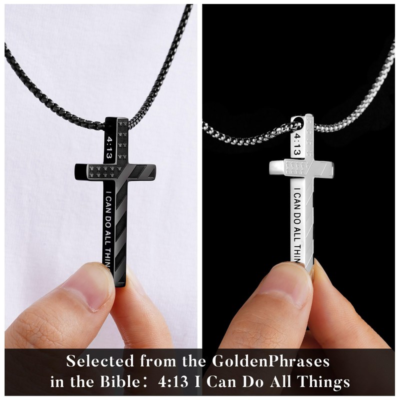 - Style: This cross necklace comes in two colors, black and silver. The pendant features the iconic design of the American flag and Bible verses, symbolizing excellence and differentiation. Its minimalist design is suitable for most men to wear.