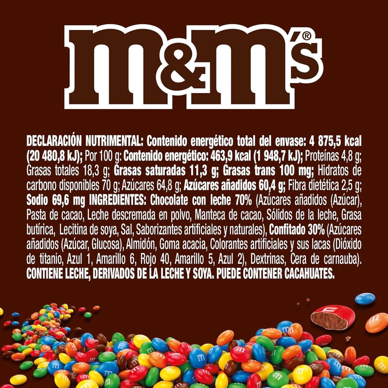 CHOCOLATE CON LECHE 70% (AZÚCARES AÑADIDOS (AZÚCAR), PASTA DE CACAO, LECHE DESCREMADA EN POLVO, MANTECA DE CACAO, SÓLIDOS DE LA LECHE, GRASA BUTÍRICA, LECITINA DE SOYA, SAL, SABORIZANTES ARTIFICIALES Y NATURALES), CONFITADO 30% (AZÚCARES AÑADIDOS (AZÚCAR, GLUCOSA), ALMIDÓN, GOMA ACACIA, COLORANTES ARTIFICIALES Y SUS LACAS (DIÓXIDO DE TITANIO, AZUL 1, AMARILLO 6, ROJO 40, AMARILLO 5, AZUL 2), DEXTRINAS, CERA DE CARNAUBA).