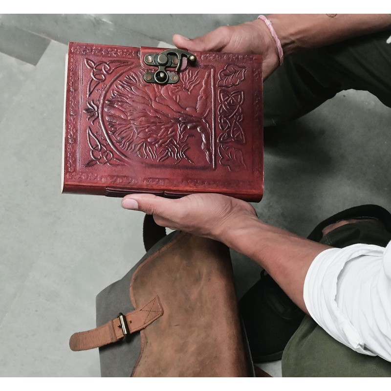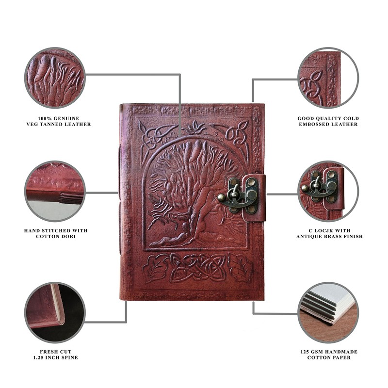 • Embossed with Tree of life on front and back side, this handcrafted notebook comprises of 96 blank pages of 125 Gsm off white handmade paper. The notebook is enclosed with the help of metallic clasp, giving it a more ancient look.