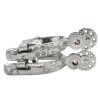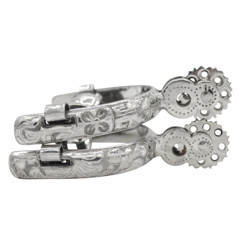 Handmade charro spurs features unique engraving over spur band and unique rowel. Adult sized. Espuelas charras finas de acero inoxidable con diseno por todo el cuerpo y rondana. Adultos de tamano.