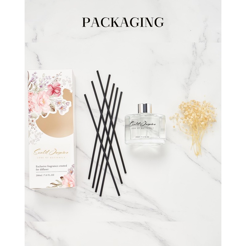 - Sunlit Jasmine - Our reed diffuser set features an enchanting jasmine scent. The delicate and alluring aroma of jasmine fills the air, creating a serene and inviting atmosphere in your home. Each whiff brings the essence of a blooming jasmine garden, adding a touch of natural beauty to your living space