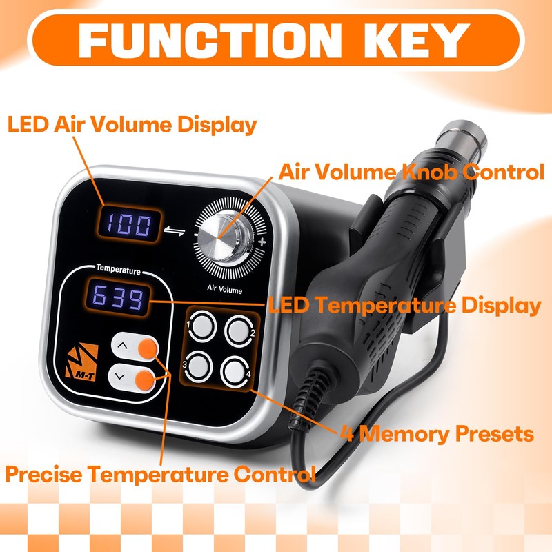 - 【Convenient Memory Modes】Equipped with four sets of temperature and airflow memory modes. Say goodbye to the hassle of readjusting temperature and airflow settings when replacing or repairing components. With just a simple press, effortlessly switch to your pre-set temperature and airflow preferences, making your work much easier