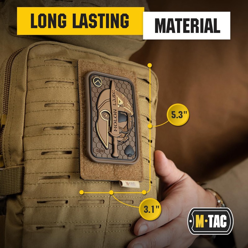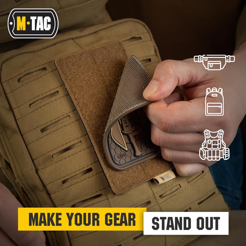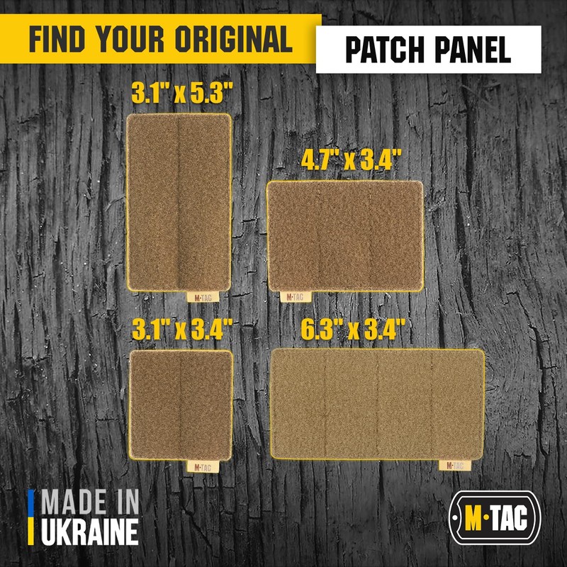 - Panel de parche táctico: en la parte delantera, un panel de bucle M-Tac está cosido en la base de plástico para fijar parches e identificadores de identificación.