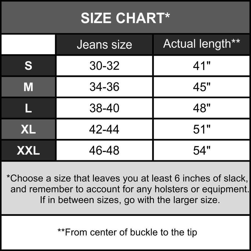 Here is a list of our belt sizes and their actual lengths (from the middle of the buckle to the tip):