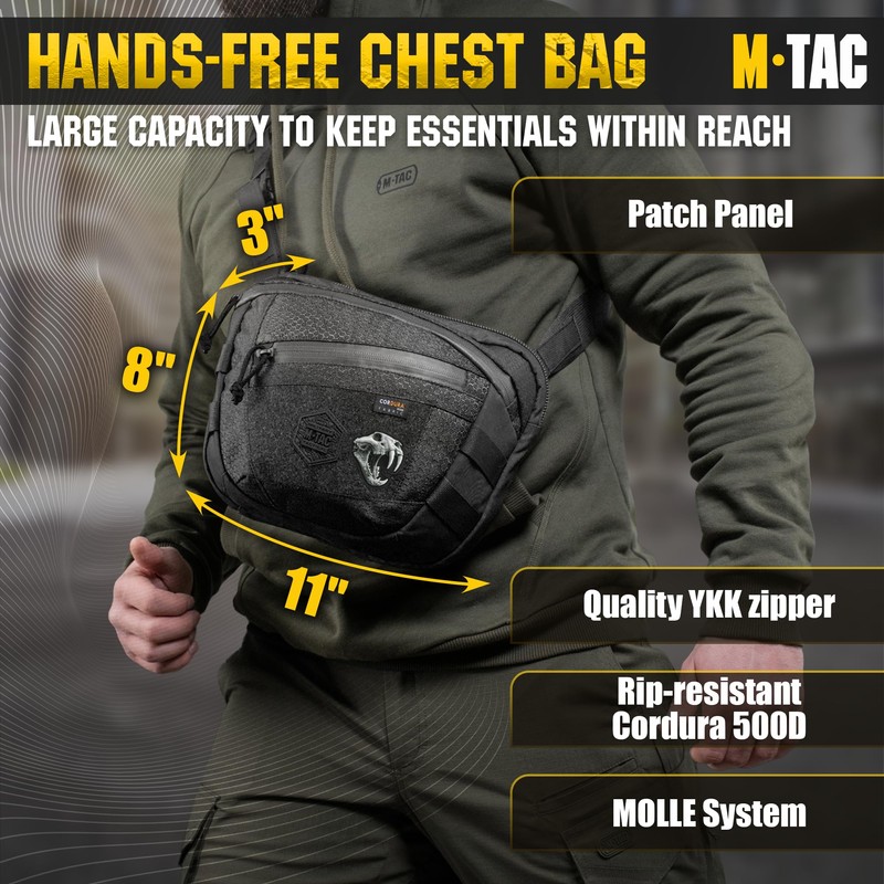 - Well-Organized Shoulder Pack: Featuring three compartments, M-Tac Large chest pack for men includes a concealed carry pack compartment with double-sided zippers; a main compartment with extra pockets; and a front compartment for access to small items - a versatile shoulder bag and chest pack for men