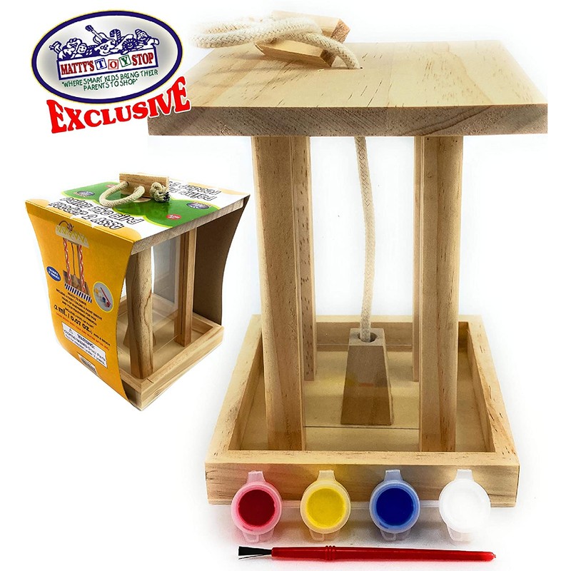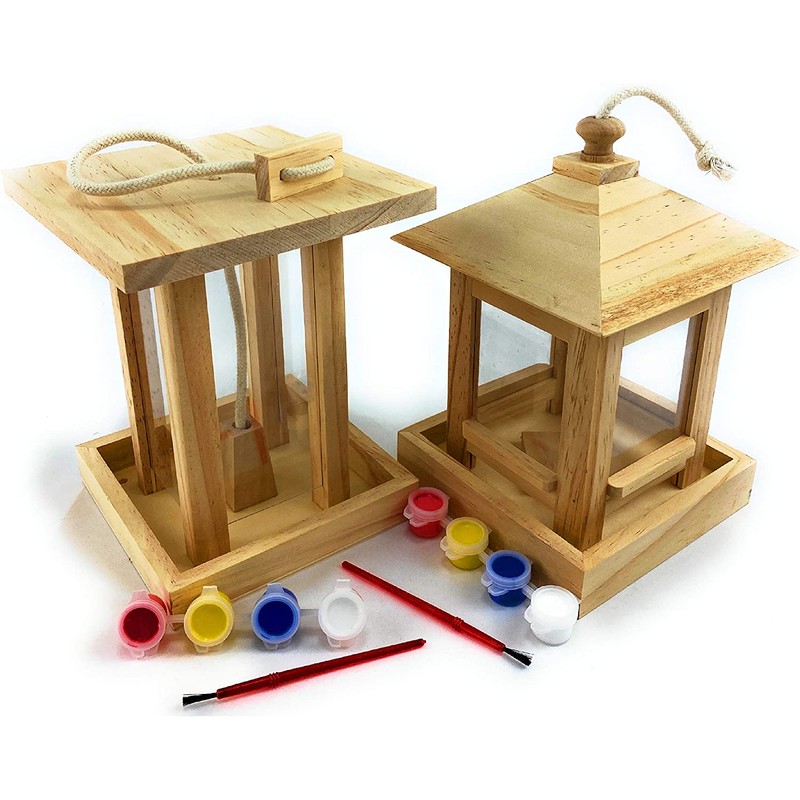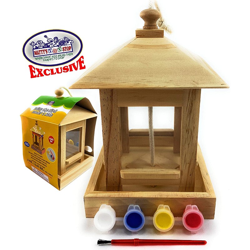 - Bird Feeder - Made of high quality wood and features 4 paint colors, 1 brush and link chain for hanging. Features an open design and removable top for easy access. Measures 7.5" long x 6.5" tall x 5.5" wide.