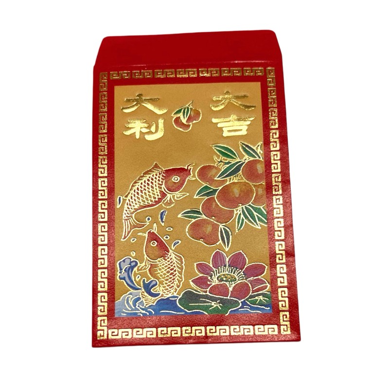 Each envelope is crafted from premium glossy red paper with a golden Greek key pattern border. The vibrant colored accents in the design bring extra life to the fish, flowers, and peaches while maintaining an elegant traditional aesthetic.