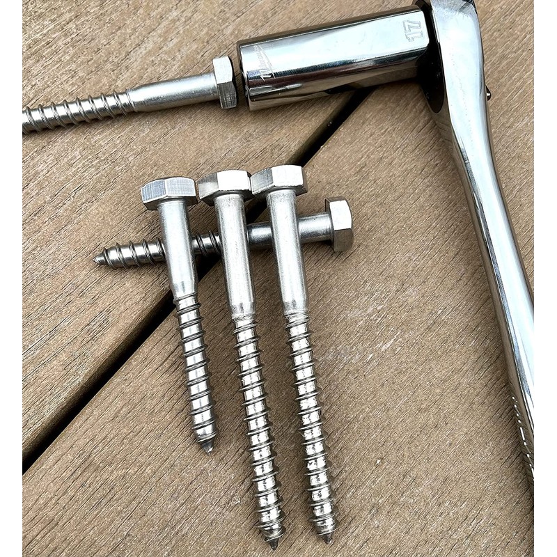- MultiScrew M10 - 10mm Coach Screws - DIN 571. Corrosion Resistant A2-70 Stainless Steel. Stainless steel coach screws, also commonly known as lag screws or lag bolts, are heavy duty woodscrews commonly used in construction and landscaping application. All of the screws in this section are stainless steel meaning that can be used outside and in areas where the fixings will come into contact with moisture.