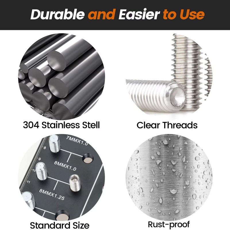 - Premium Stainless Steel: Made from high-quality 304 stainless steel, these socket set screws offer excellent corrosion, rust, and oxidation resistance, ensuring durability and reliable performance in a wide range of environments. Please note that the magnetic properties of 304 steel always show weak magnetic properties due to the structure transformation reasons. This will not affect its high rust resistance, feel confident choosing this.
