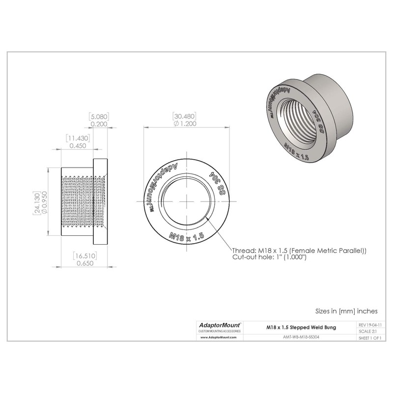 M18 x 1.5 Stainless Steel 304 Female Threaded Stepped Weld Bung Metric Mounting Boss Fitting (OD 1.0") with Top Head (OD 1.2")