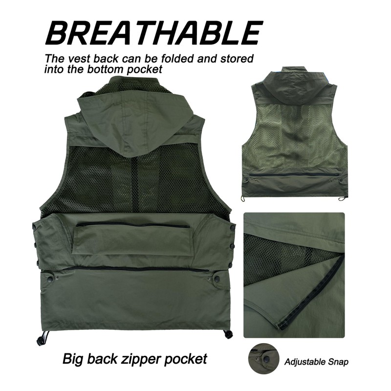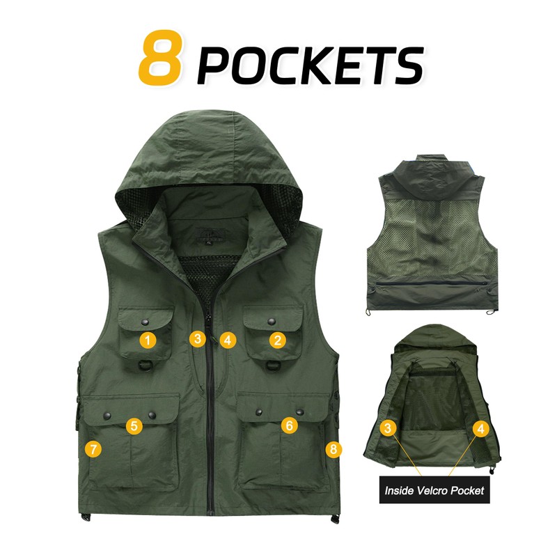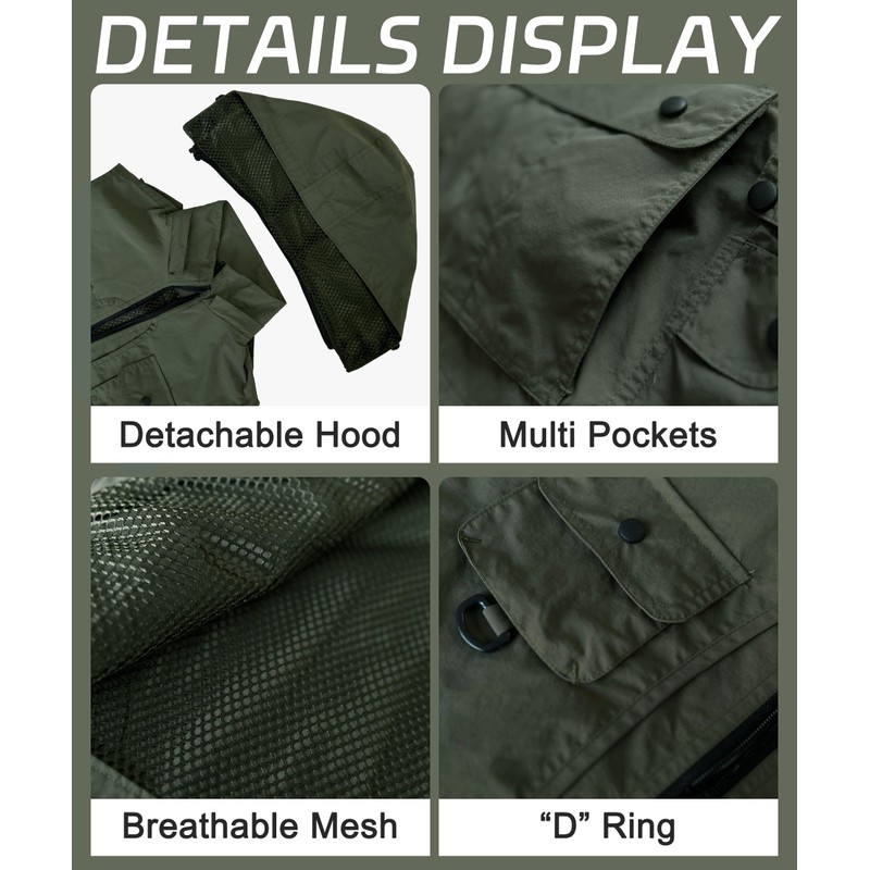 • Multi-pockets can hold almost everything you need for outdoor hiking, fishing or photography, detachable hood