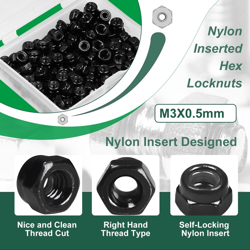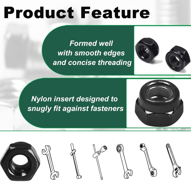 • Self-Locking Nylon Insert: Nylon insert designed to snugly fit against fasteners, preventing any risk of loosening during use, whether you're working on a project that involves severe shaking or you tend to tighten things, these lock nuts have your back